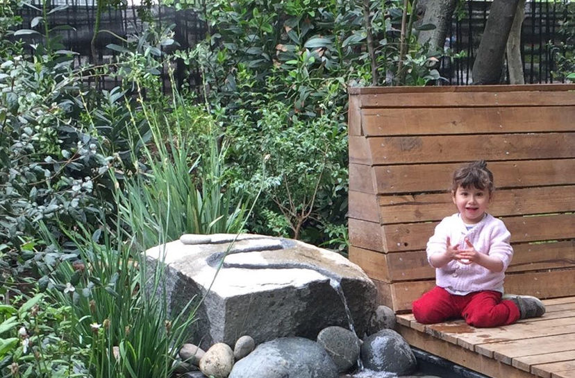 Se pensó en la creación de un espacio de juego natural que alude a una quebrada de la zona central. Es un recorrido que se interna en el bosque cruzando “el río de piedras”, llegando al claro del bosque donde está el espacio de detención “el deck y la banca”, un lugar para estar en calma, mientras los niños juegan en libertad.