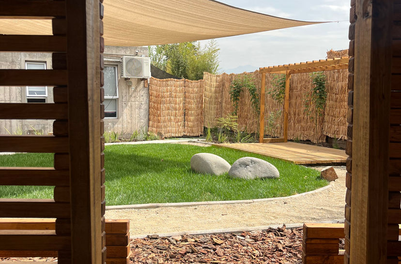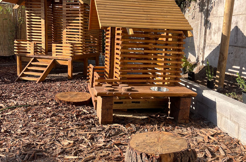 Un patio de juego y aprendizaje para niños de Kinder y prekinder. Incorpora un sendero que recorre el patio, descubriendo distintos espacios y texturas. Un huertos, casa en el árbol, aulas de aprendizaje, cocina de barro, sendero de rodados.
